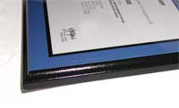 Laminated on black wooden plaque with blue border.